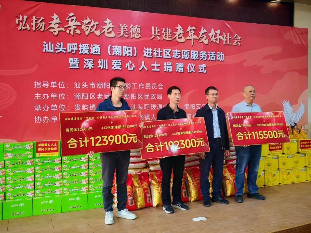 此次捐赠款物定向帮扶贵屿、谷饶、铜盂三镇1439名汕头呼援通潮阳中心帮扶对象,每位长者可领取200元现金及配套慰问物资,实现精准化、全覆盖帮扶。这已是深圳爱心人士既今年10月“敬老月”捐赠41.25万元款物之后,第二次助力潮阳养老事业,两次捐赠累计超84万元。
